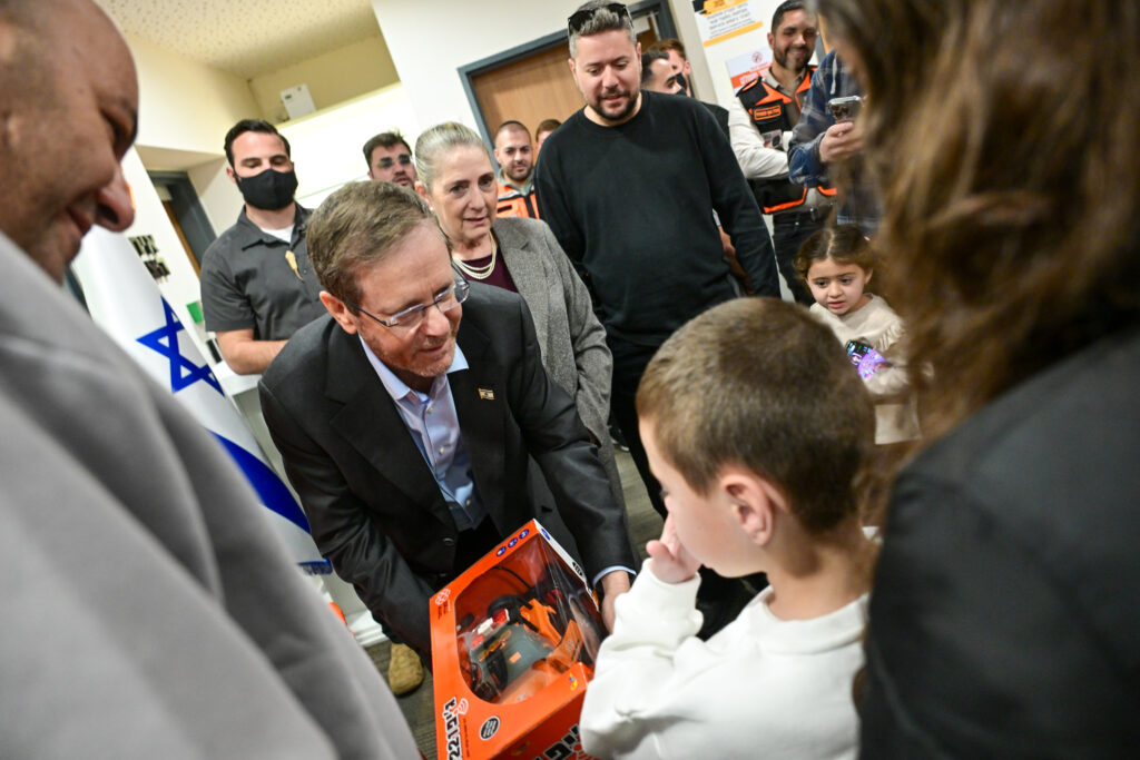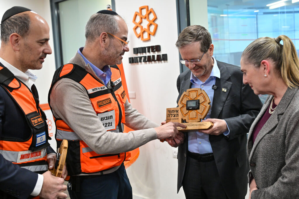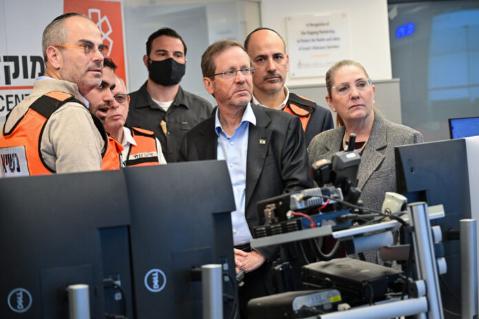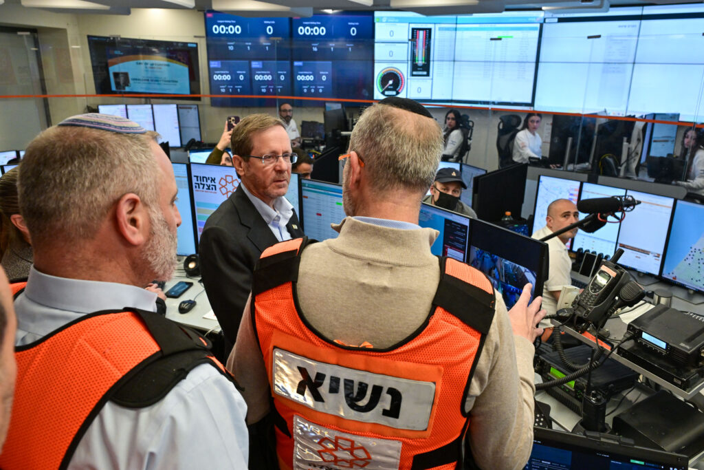 נשיא המדינה יצחק הרצוג ביקר הבוקר, יום רביעי, כ”ב באדר, 11 במרץ, במטה המבצעי הארצי של איחוד הצלה, בליווי נשיא הארגון, אלי ביר.